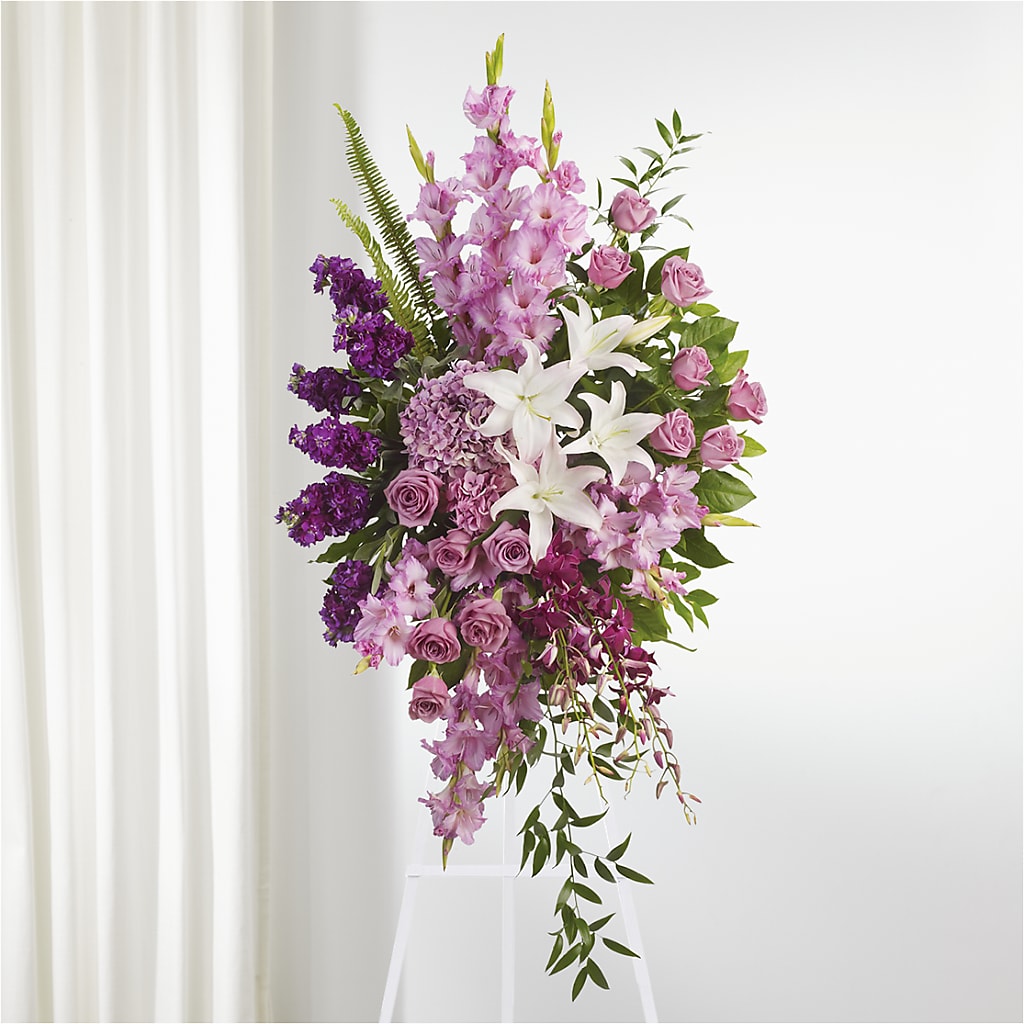 Share your condolences and a shoulder to lean upon with this genuine display of lavender roses, gladiolus, and lilies suitable for a farewell service.